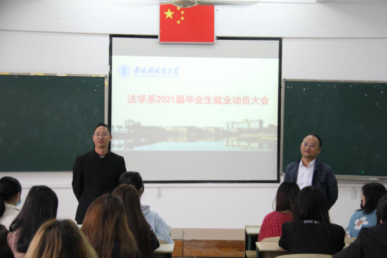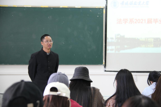 近日,法学系2021届毕业生就业动员大会在主教学楼607教室召开。党总支副书记孙炜、毕业班班班主任、法学系2017级全体学生参加了本次会议。会议由学工办主任何华生主持。