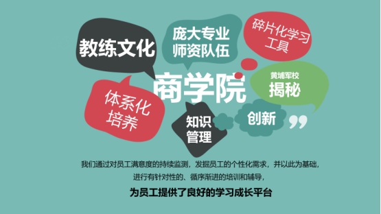 在职期间,表现优异者均有机会报名参加“梯队人才培养”培训,课程包含经营管理、员工管理、公文写作、商务礼仪等。表现优秀并通过培训班考核的员工即有资格应聘相关管理职位;