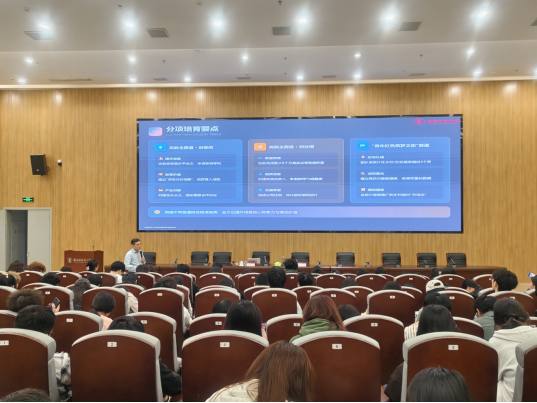 本网讯(教务处<创业学院> 邹金成)为深入推进创新创业教育改革,系统备战中国国际大学生创新大赛(2026),4月9日下午,我校在湘湖校区研究生实验室楼一楼报告厅举办《中国国际大学生创新大赛2025国金项目深度解析与2026备赛策略》专题培训讲座,教育部首批全国万名优秀创新创业导师、北京中创教育集团董事长徐俊祥应邀主讲。校党委常委、副校长陈云霞出席并主持讲座。教务处(创业学院)有关负责人、各学院就业创业专员、参赛师生代表及创新创业学生社团成员等300余人参加讲座。